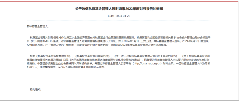 4月22日(rì),中基協再次發布《關于敦促私募基金管理(lǐ)人(rén)按時填報2023年(nián)度财務報告的通知》,如(rú)下圖所示: