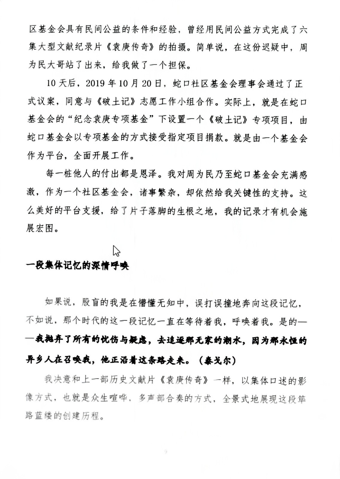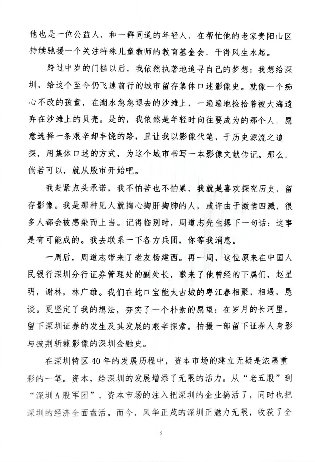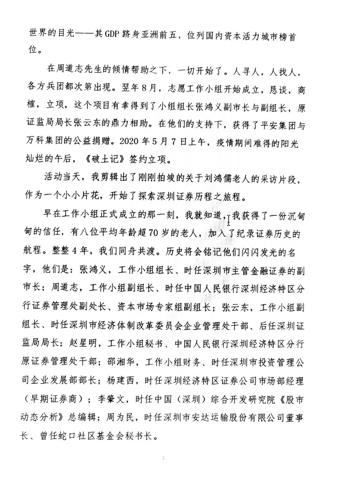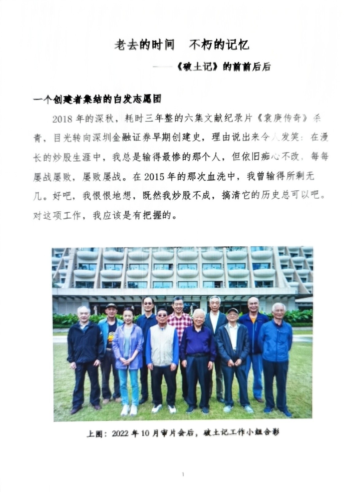 爲了記錄深圳市證券市場創建的曆史,原深圳市副市長張鴻義原深圳市人(rén)民(mín)銀行證券管理(lǐ)處副處長周道志、原深圳市證券管理(lǐ)局局長張雲東等一批參與深圳證券市場前期開創的親曆者組成工(gōng)作(zuò)小組,2019年(nián)開始策劃拍(pāi)攝《破土(tǔ)記》。《破土(tǔ)記》拍(pāi)攝獲得(de)了中國(guó)平安集團、深圳萬科(kē)集團的捐助支持。《破土(tǔ)記》選擇了《袁庚傳奇》的導演塗俏女(nǚ)士出任導演,并采用民(mín)間公益方式,以蛇口社區基金會爲平台進行運作(zuò)。